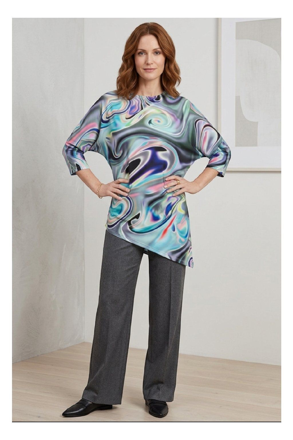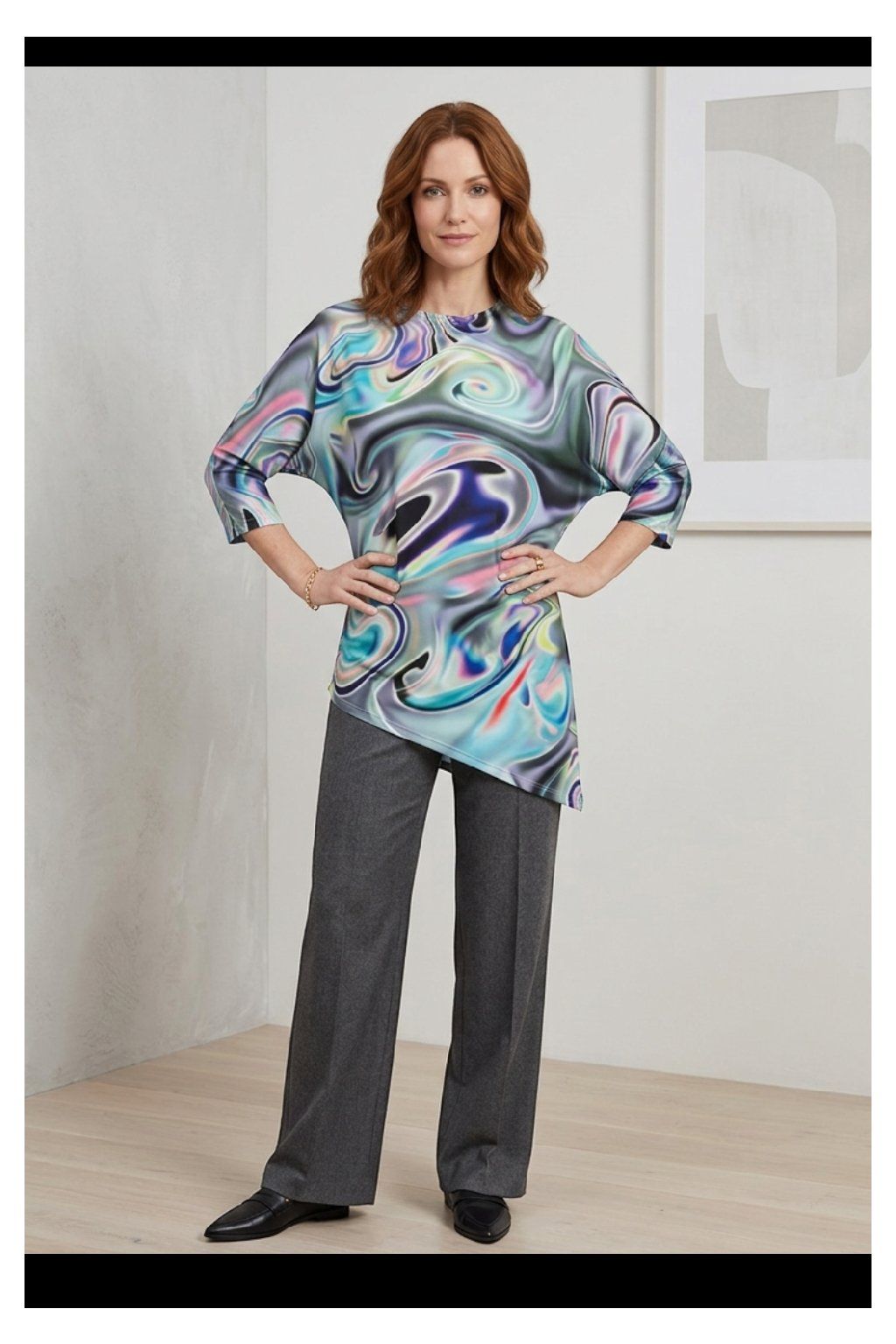 Asymetrický top s přinechaným netopýřím rukávem. Originální autorský střih a úžasný motiv látky zaručí, že budete nepřehlédnutelná.