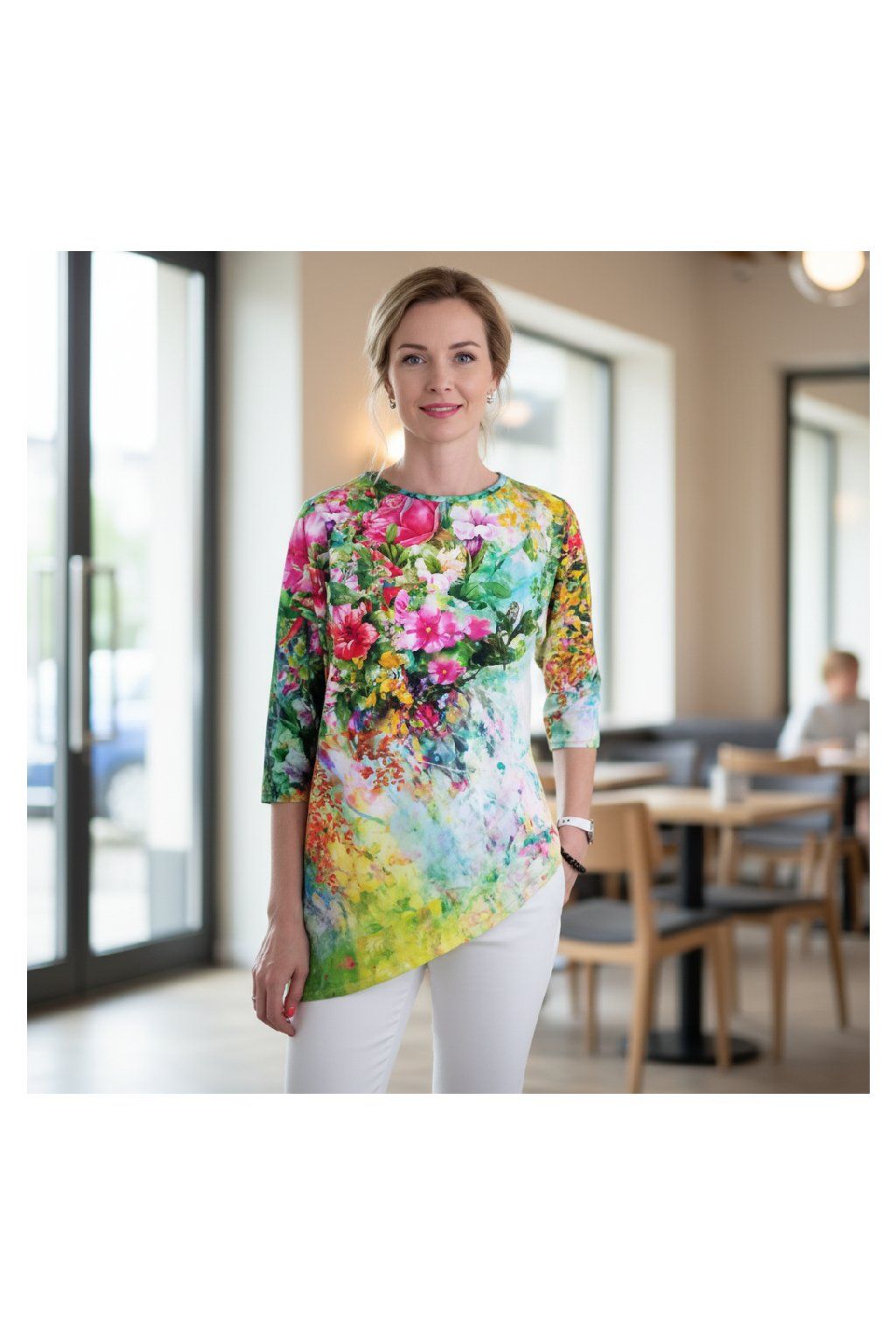 Asymetrický top s přinechaným netopýřím rukávem. Originální autorský střih a úžasný motiv látky zaručí, že budete nepřehlédnutelná.