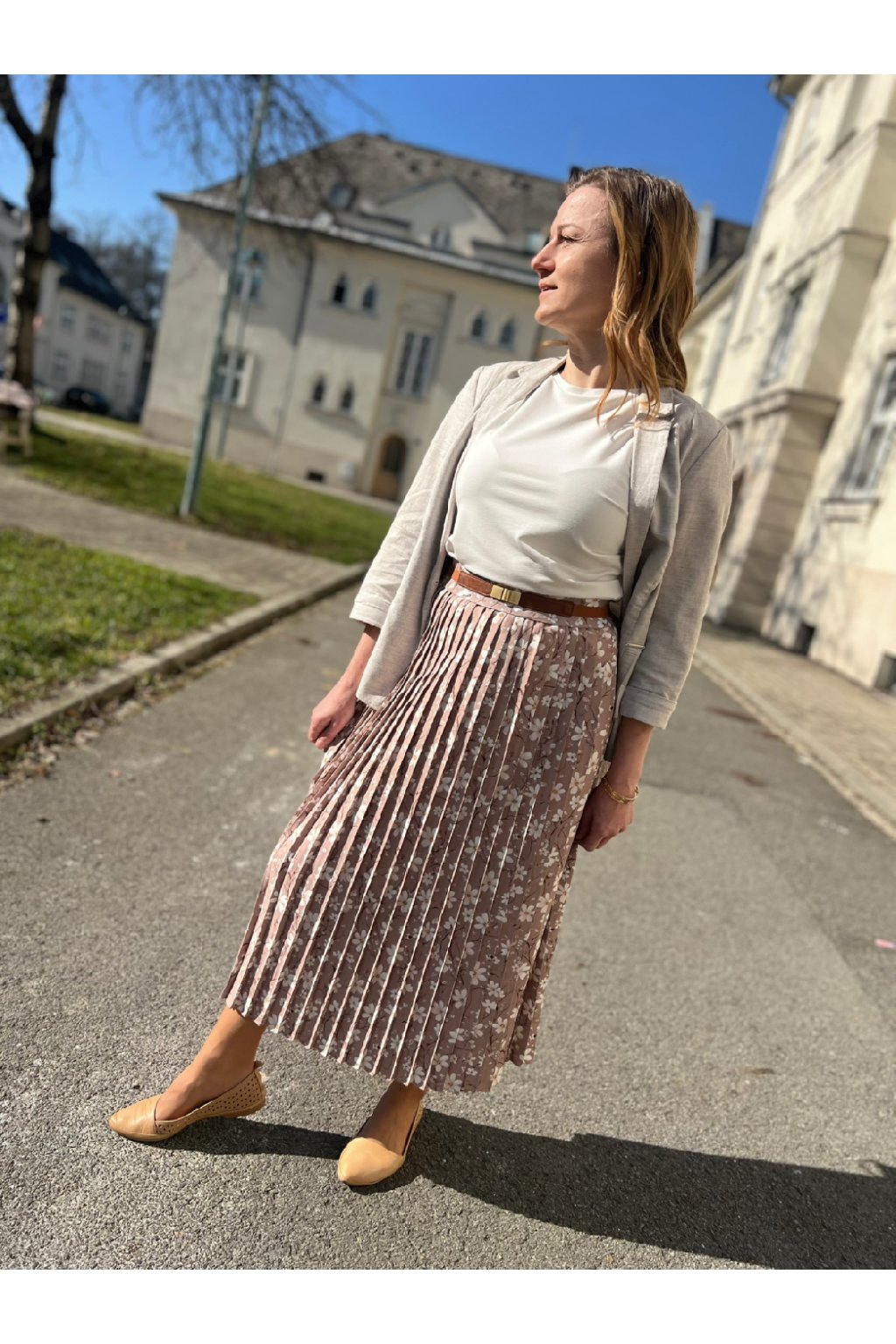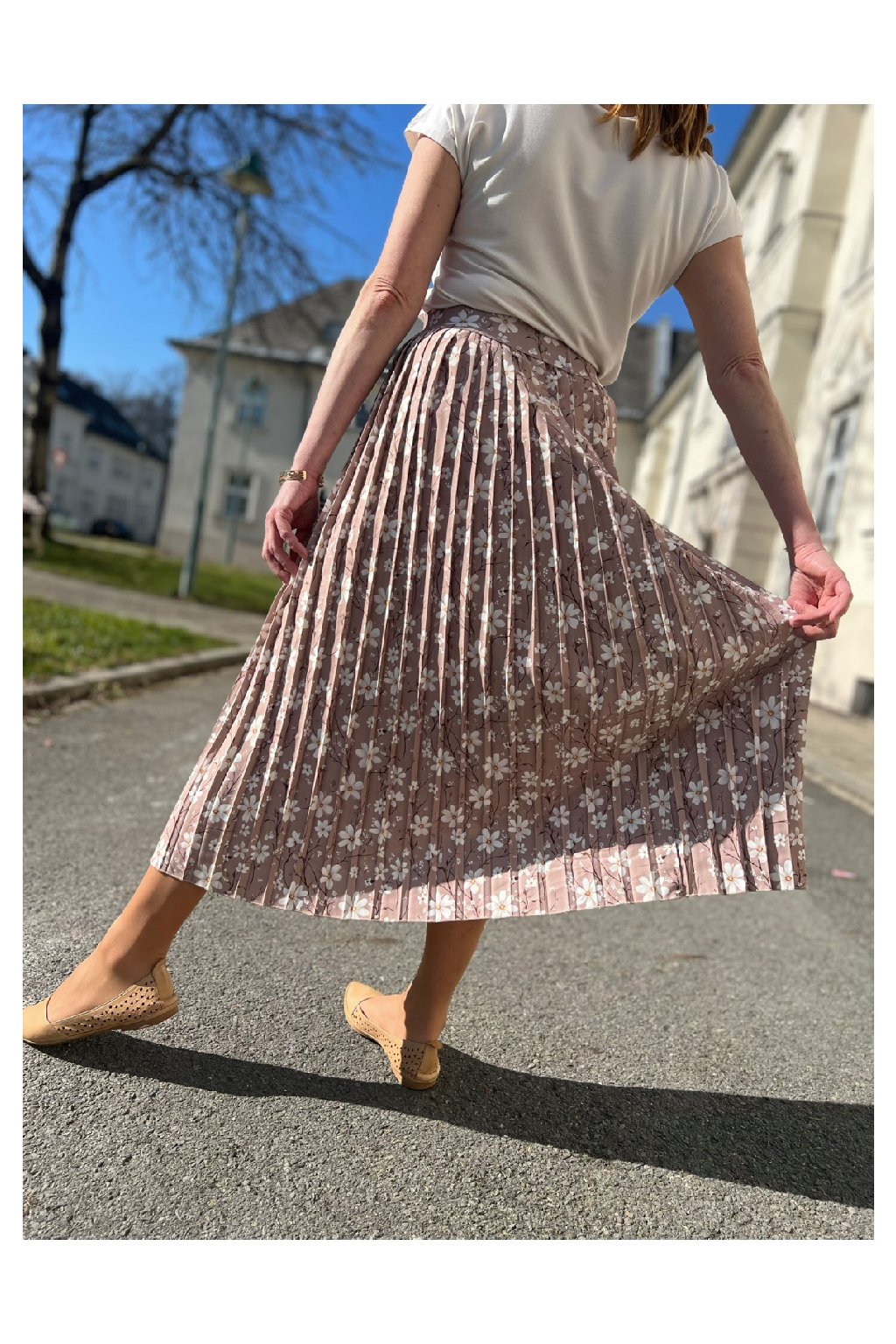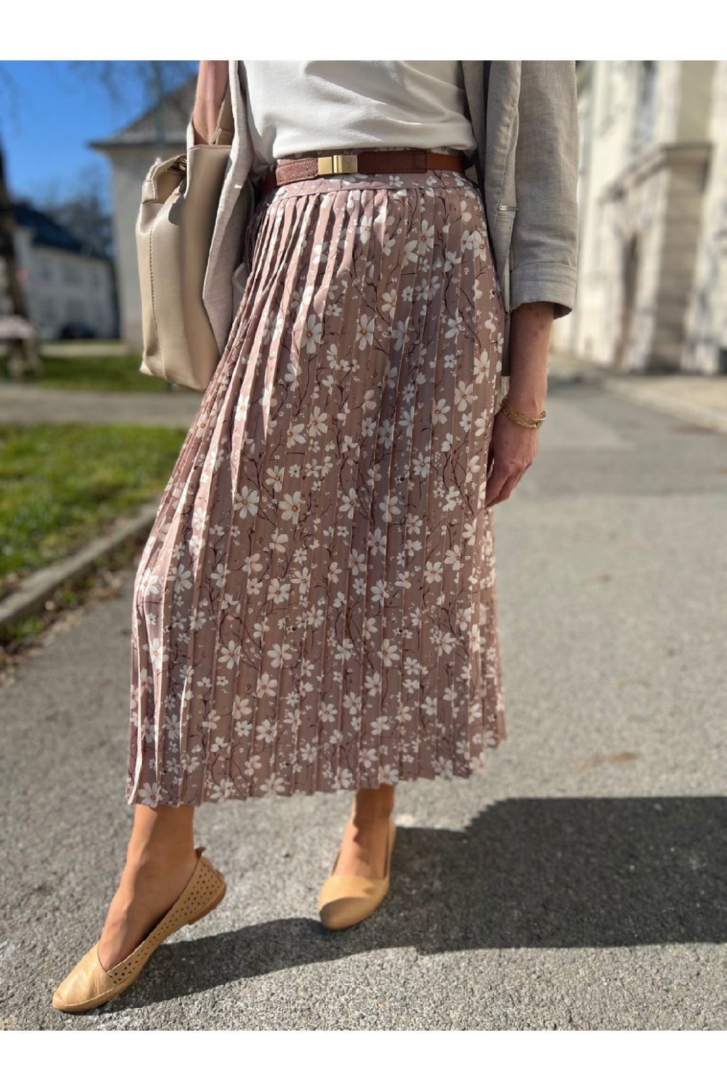 Plisovaná midi sukně béžová s bílými kvítky