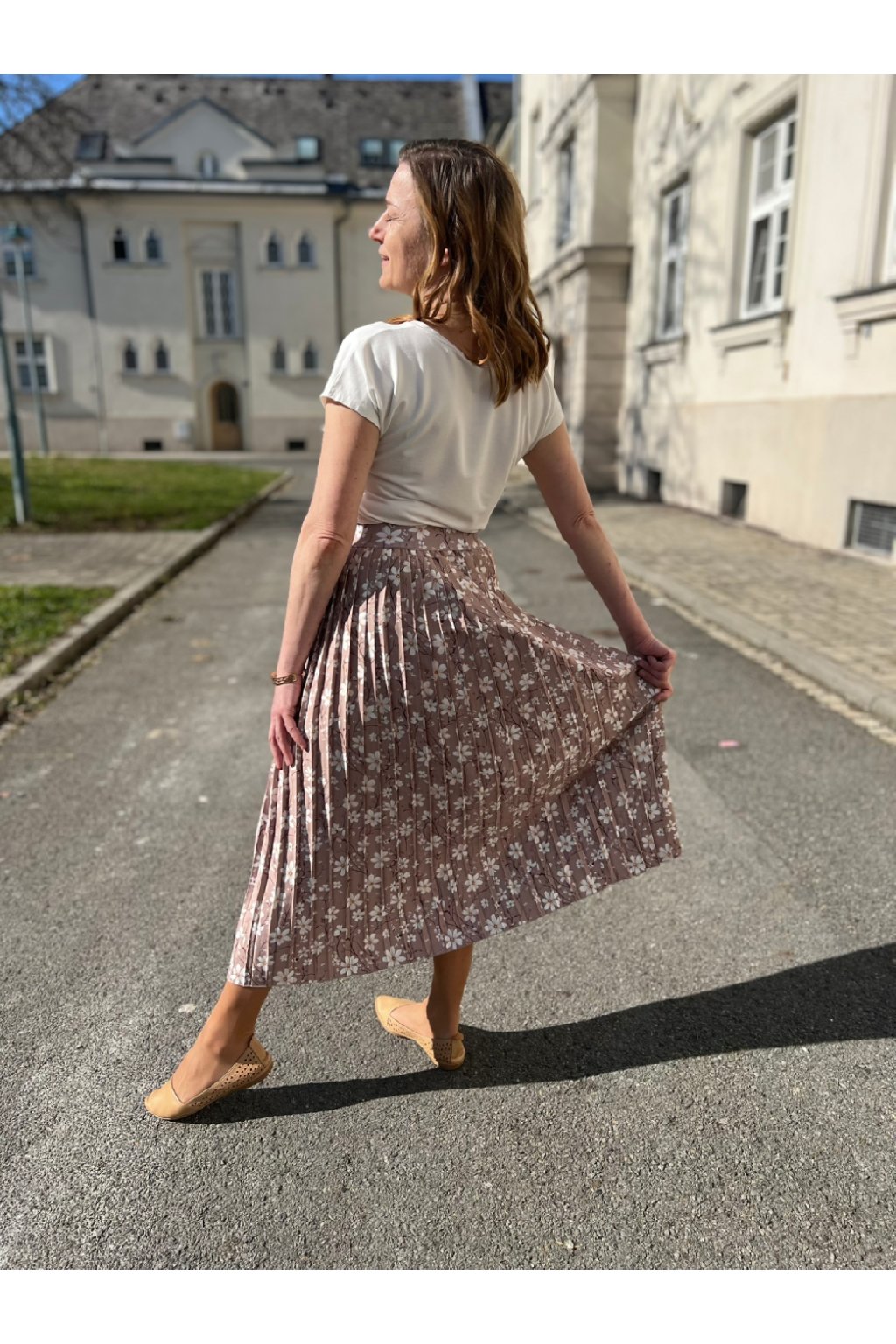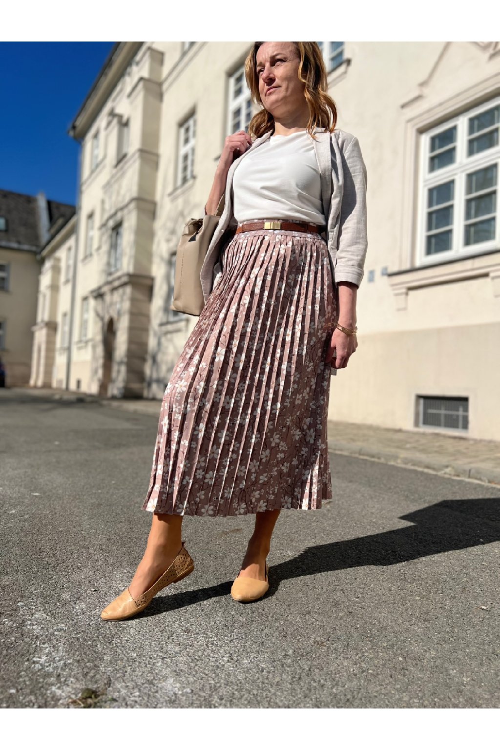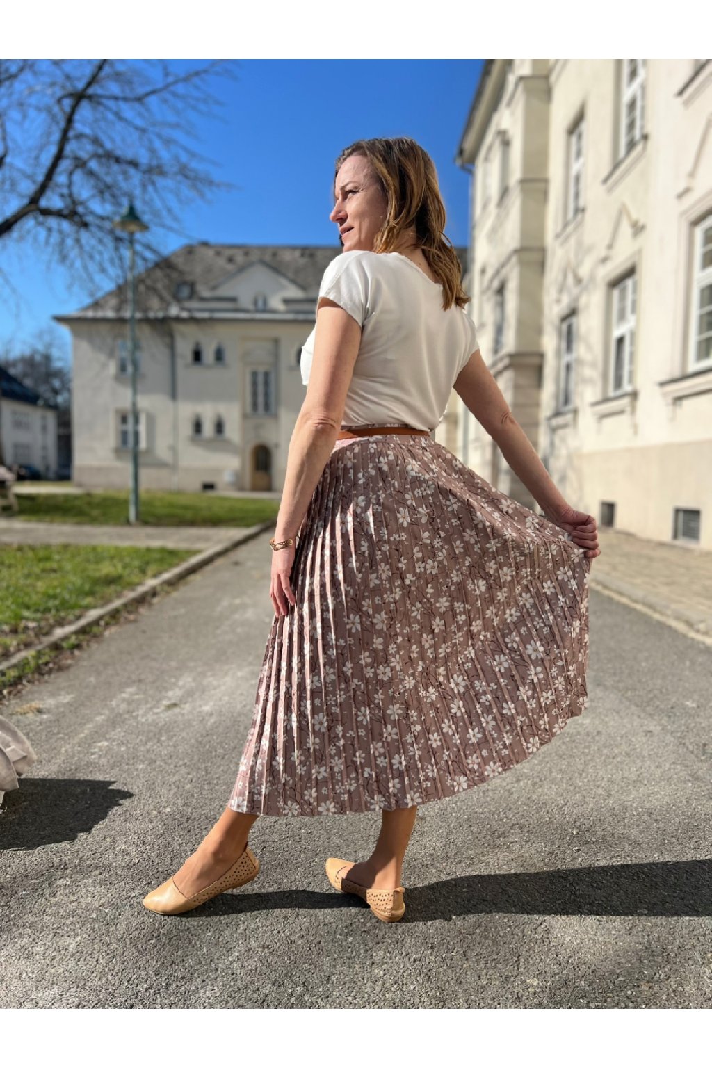 Plisovaná midi sukně béžová s bílými kvítky